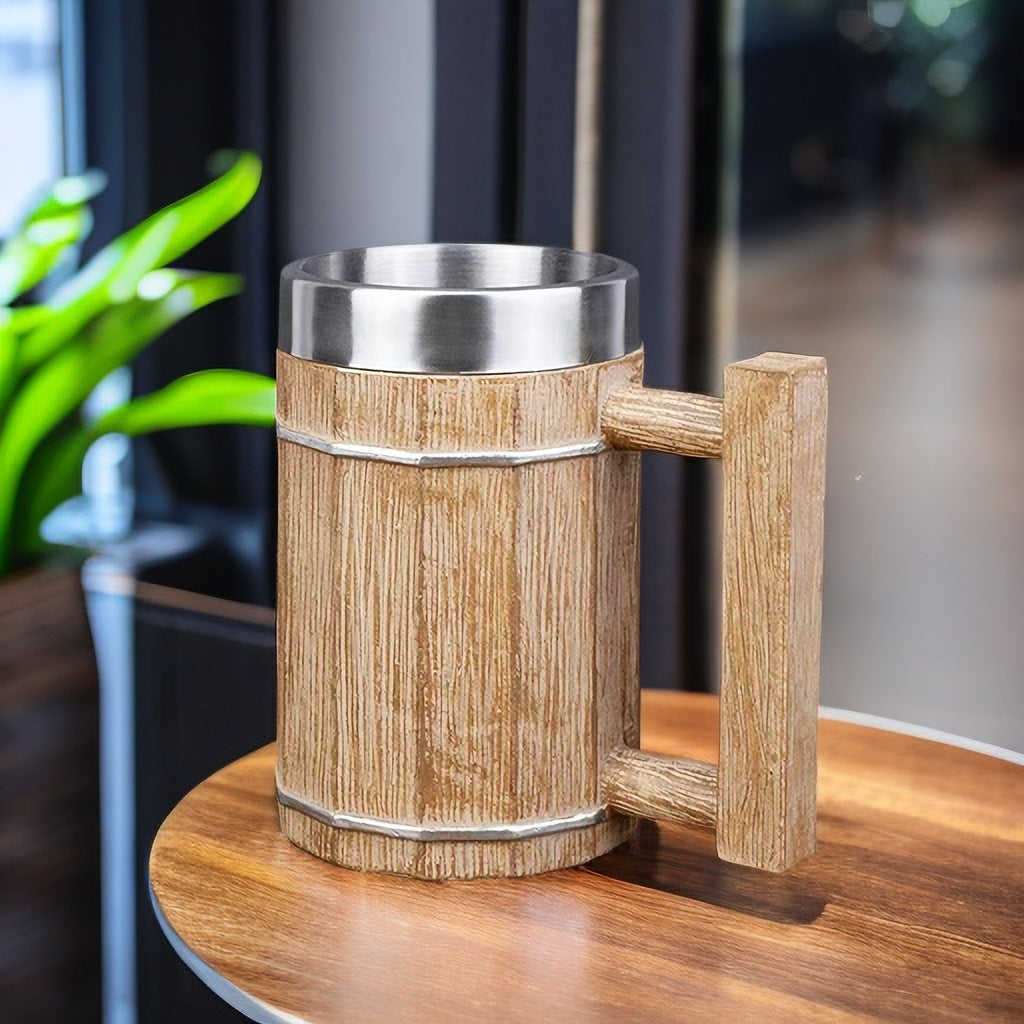 Kufel wykonano z wysokiej jakości tworzywa o realistycznej fakturze drewna, a jego wnętrze wykończono stalą nierdzewną, co pomaga zachować świeżość napoju i ułatwia czyszczenie.