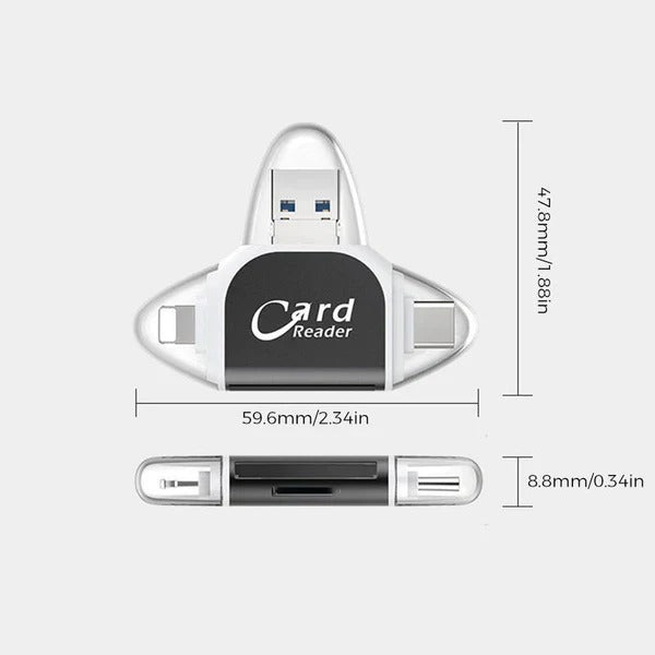 ➤【Interfejs 4 w 1】: Czytnik kart pamięci posiada kilka interfejsów, USB/Usb C (typ C)/Micro USB/Lightning/Port ładowania dla urządzeń Apple/Gniazdo kart SD/Micro SD, dzięki czemu można łatwo przesyłać potrzebne pliki między różnymi urządzeniami.