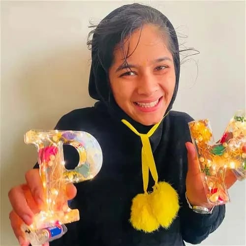 Rozświetl swój pokój magicznym blaskiem liter z suszonymi kwiatami, zamkniętych w krystalicznie czystej żywicy. Ten spersonalizowany alfabet dodaje odrobiny natury i elegancji każdemu wnętrzu — świetny jako prezent lub unikalna dekoracja.