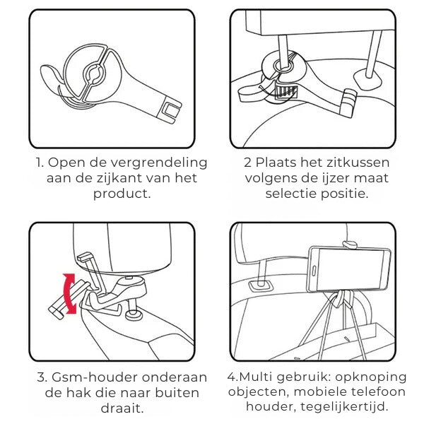 Specjalna półotwarta konstrukcja ułatwia instalację tych haków, nie ma potrzeby demontażu zagłówków, można swobodnie regulować lub usuwać haki w ciągu kilku sekund bez dodatkowych narzędzi, szybko i łatwo.