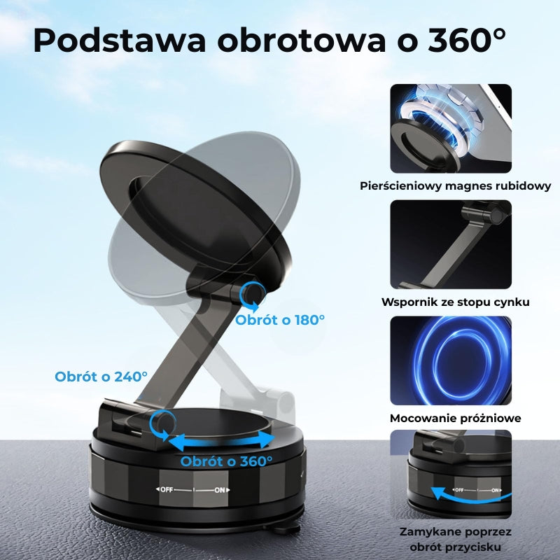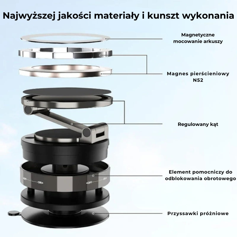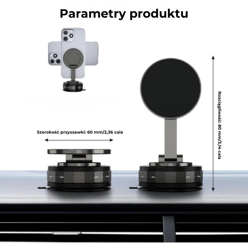 Wystarczy nacisnąć, obrócić i gotowe. Pierścień magnetyczny N52 współpracuje z silikonową podkładką próżniową, aby utrzymać siłę do 16 N – wystarczającą nawet dla największych modeli Pro Max.