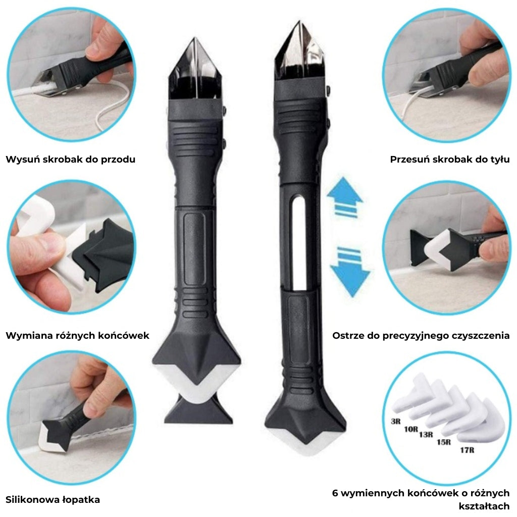 Ten kompletny zestaw został zaprojektowany tak, aby połączyć 3 praktyczne funkcje w jednym narzędziu. Może być używany jako szpachelka do silikonu, skrobak do resztek oraz precyzyjne ostrze tnące.