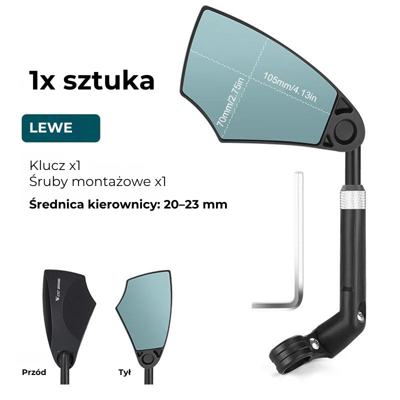 WIĘKSZA WIDOCZNOŚĆ, BEZPIECZNIEJSZA JAZDA NA ROWERZE — powiększona powierzchnia lusterka zapewnia szeroki, 180-stopniowy widok do tyłu, bez potrzeby obracania głowy. Duże lusterko wsteczne daje wyraźniejszy obraz i lepszą kontrolę nad tym, co dzieje się za Tobą, co znacząco poprawia bezpieczeństwo podczas jazdy.